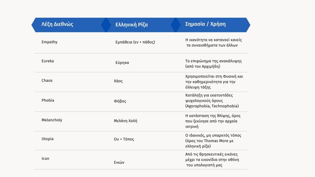 Λέξεις όπως analysis, biology, democracy, physics, history και technology καταδεικνύουν ότι τα ελληνικά αποτελούν ένα παγκόσμιο εργαλείο σκέψης και γνώσης.